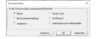 3Optionen anklicken. Das Dialogfeld Druckoptionen - Ganzer Quilt wird geöffnet.